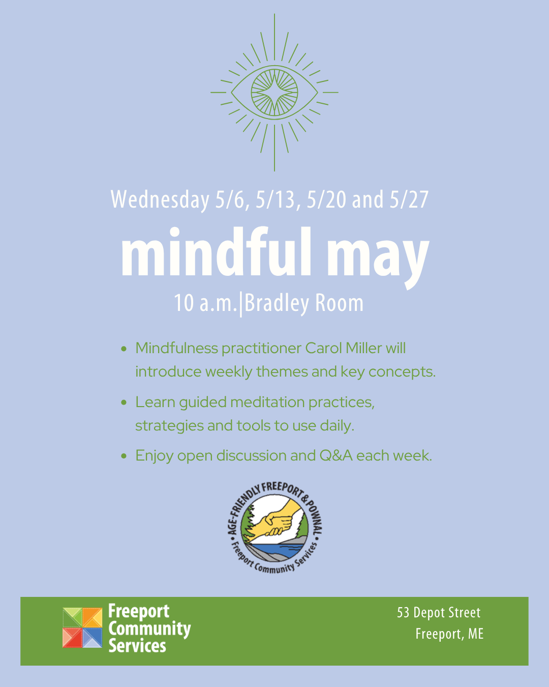 Beginning Wednesday, May 6, join mindfulness practitioner Carol Miller for a month-long series in the FCS Bradley Room at 10 a.m. Each week, Miller will introduce a new concept and theme to help those new to mindfulness get started. Throughout the series, you’ll learn about mindful meditation practices, strategies and tools you can regularly use at home. Classes will also encourage a weekly Q+A session and discussion.